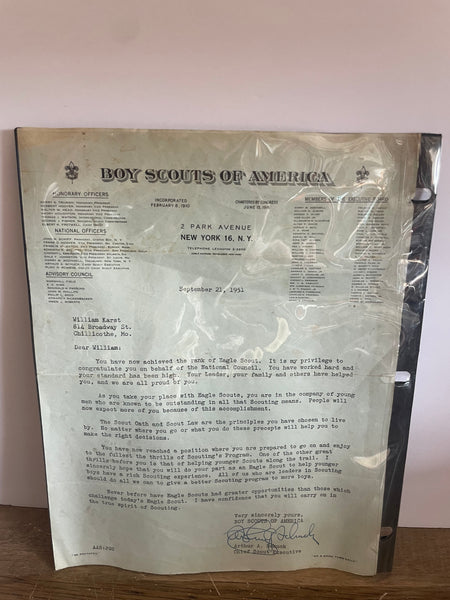 Vintage 1951 Boy Scouts of America Eagle Scout Letter of Achievement New York Headquarters